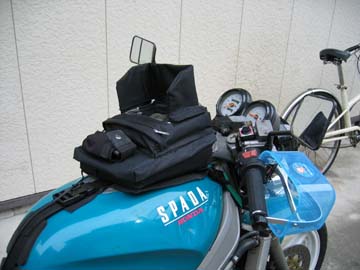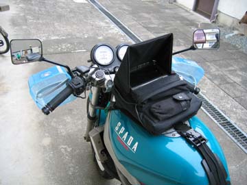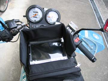 カーナビは一般道中心のワンデイツーリングで 威力を発揮し必需品になっています。 知らないところも平気で行けるし、 間違ったら すぐ分かります。 特に目的地まで、後何キロ、到着予定時刻 何時何分と教えてくれるのは励みにもなります。 ただ、画面が水平なため、晴天の昼間は、画面が 全く見えません。 そこで、囲いを作り変えました。 |