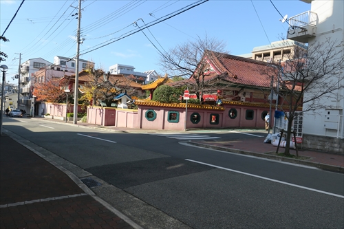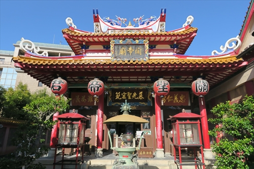 1888年に鎮座した寺院で関帝聖君(関帝)が主神で、他に大慈大悲観世音菩薩(聖観音)と天后聖母(媽祖)も祭ってある。1948年に建てられたものが1995年の阪神淡路大震災など過去に何度も被災し、1999年にそこから復興したもの。全体的な特徴としては日本の伝統的な建築様式に中国風の意匠や様式を取り入れ他にあまり例を見ない「華和(中日)折衷」となっている。管理運営は一般社団法人中華会舘。国内にある関帝廟は他に函館市函館中華会館、横浜中華街、和歌山県那智勝浦町、京都府福知山市、大阪市、長崎市崇福寺、長崎市興福寺、那覇市などにある。