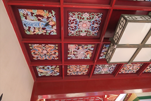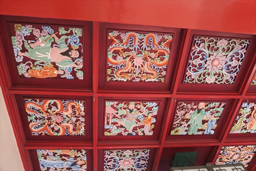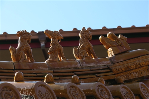 本堂の屋根に一際目立つ青龍は北京の紫禁城と同じ皇帝色の瓦の上に飾られている。宝玉をつかんで、お互いにらみ合っている青龍をみると幸せになるという言い伝えがある。 |
