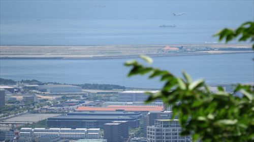 右上に離陸する飛行機が見える。スカイマーク106便羽田行 |
