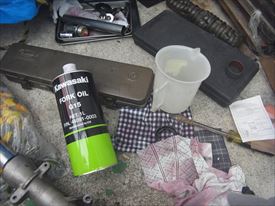 サスは柔らかめだったのでカワサキの15番を規定量、インナーチューブ上端から油面まで103mm入れた |