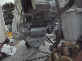 後でサービスマニュアルを見ると、後ろのタイヤを外さずとも、エンジンマウントとカラーを外せば良い