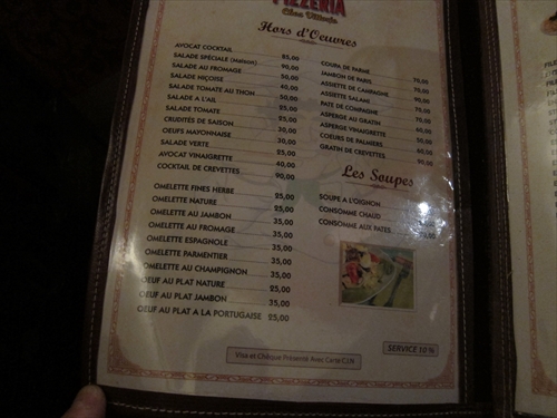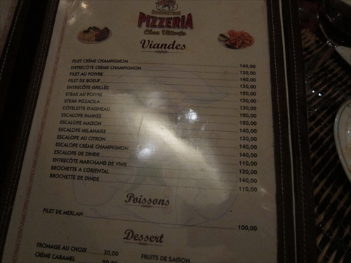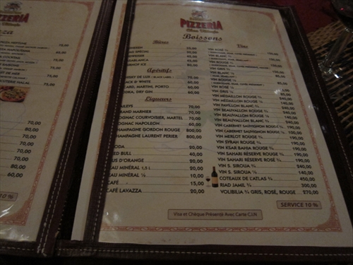boissons(飲み物) ビール 40-60ディルハム 、アペリティフ 60-70ディルハム リキュール シャンパン800ディルハム、ワイン 140-300ディルハム 1ディルハム=11円 |