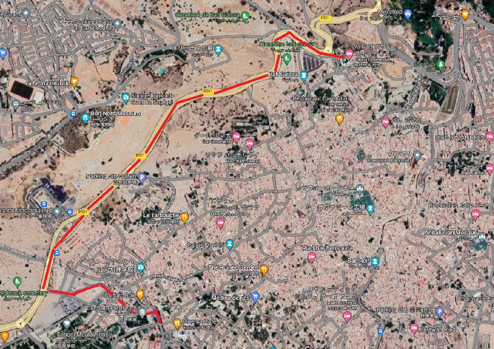 ソフティル・パレ・ジャメはフェズの旧市街の北東にある5つ星ホテル。このHP作成時(2023/4)には閉業していた。前日に奥さんがこのホテルのエステを予約。