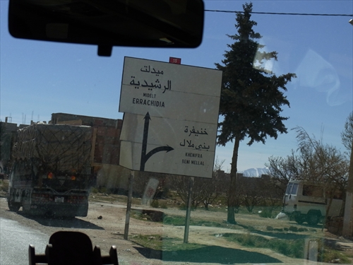 Zaidaの集落の手前、まっすぐはこれから南に進む国道13号線、右は西に進む地方道(R503)、Khenifra(ヘニフラ)、BeniMellal(ベニメラル) |