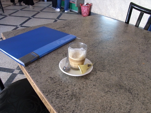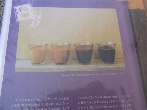 右からカフワ(qahwa アラビア語でカフェインの意)、 カフワ・メハルサ(Quafwa Mefarsa ミルクを少し入れたもの) カファノスノス(NossNoss、コーヒーミルク半分半分 カフワ・ラ・ハラブ(ミルク多め) |