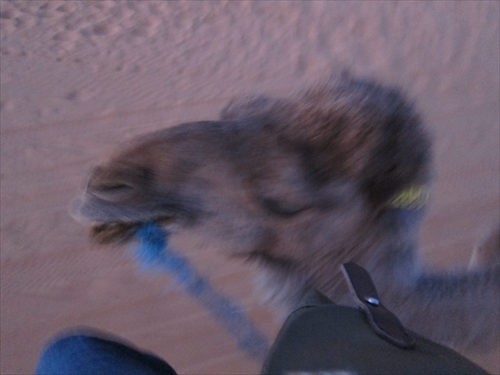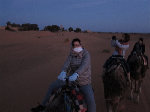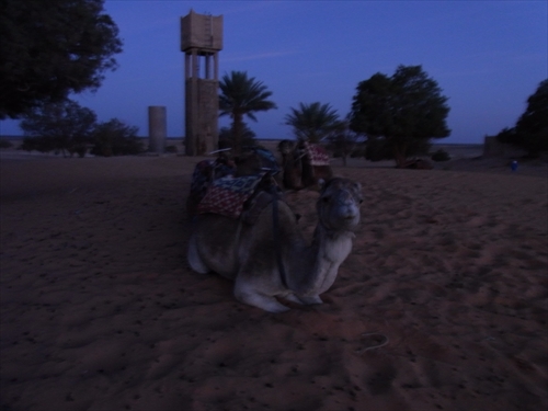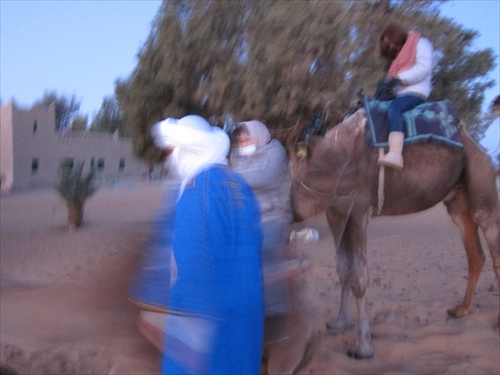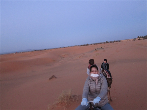 駱駝に乗っての朝の散歩。奥さんが駱駝に乗って、駱駝が立ち上がるところ。 |