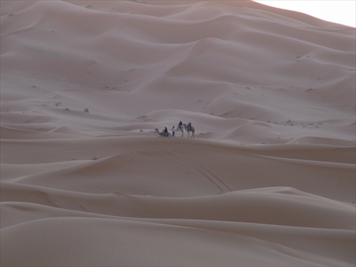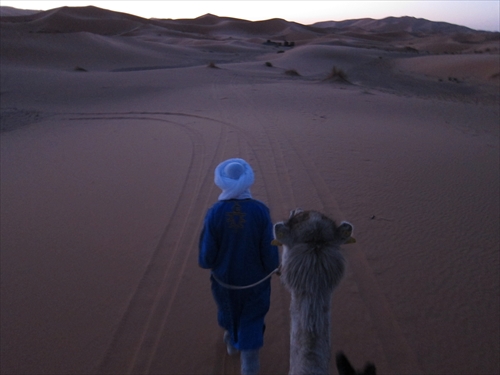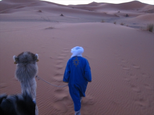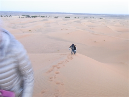 駱駝から降りて砂山を登る |