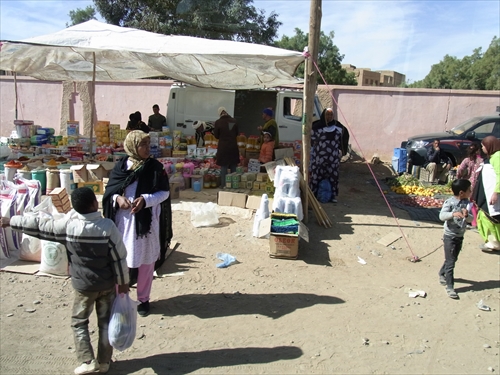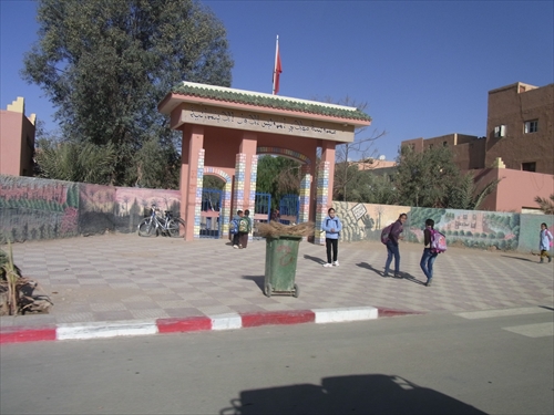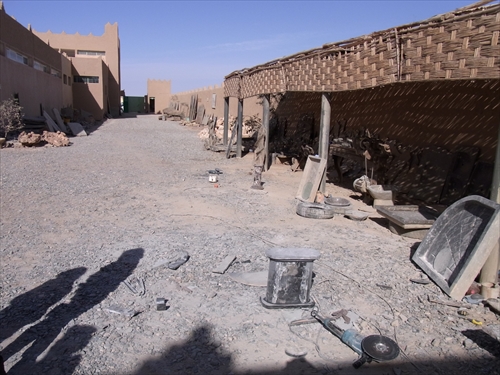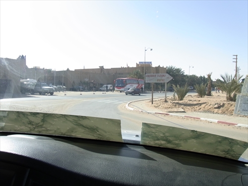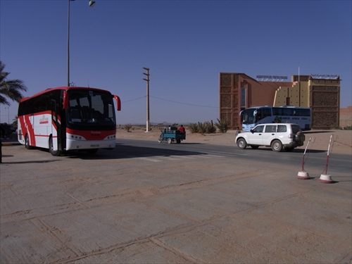 メルズーガ北30kmのところにあるHay Salam(ヘイサラム)、奥は四つ星ホテルのErfoud Le Riad、看板ににあるKasbah
