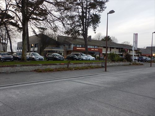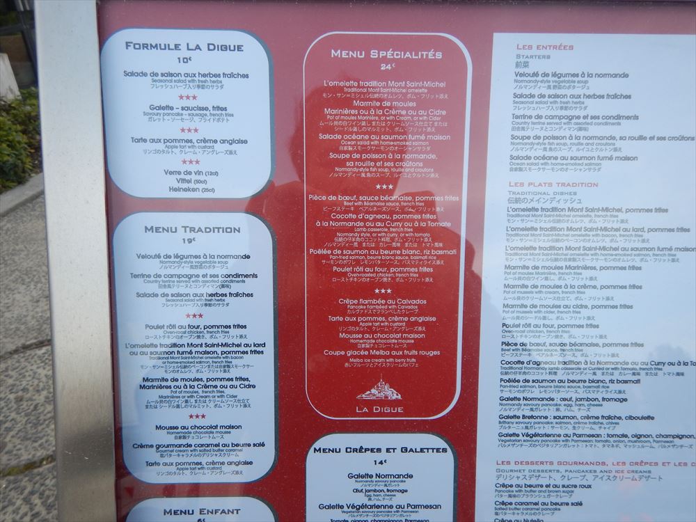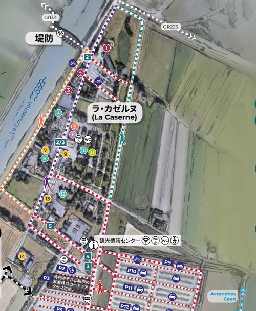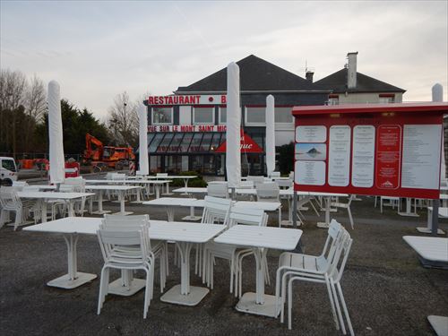島から2㎞歩いてLa Cazerneに到着。一番島寄りにあるレストランLe Relais St-Michel前。右下の地図① |