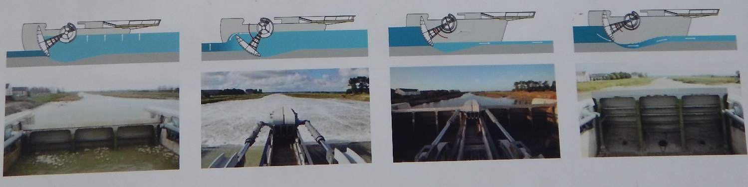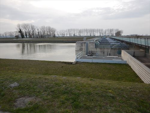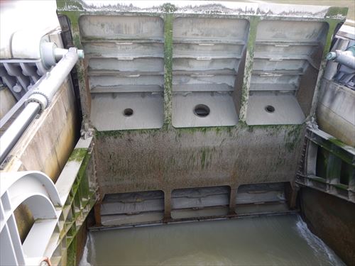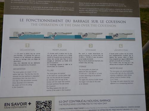 ①decantation 傾瀉(けいしゃ、沈殿物と液体を分離する操作) 1h30 avant la pleine mer,les vannes sont fermes. le premier flot bute sur l'obstacle et les sediments se deposent en aval du barrage c'est de ses sediments limitera l'envasement de Couesnon 満潮の1時間半前に水門が閉まる。最初の波は障害物に衝突し、堆積物はダムの下流に堆積する。これらの堆積物がクエノンの堆積を制限することになる。 ②remplissage (充填) 10 minutes avant la pleine mer au plus tard,les vannes s'ouvrent et la maree remplit le Couesnon par sur-verse(par le dessus des vannes)avec l'eau la moins chargee en sediments . lamaree entre dans le couesnon. le remplissage respecte le debit et le volume d'eau du Couesnon 遅くとも満潮の10分前には水門が開き、潮が溢れ(水門の上から)、堆積物の最も少ない水がクエノン川に流れ込む。潮がクエノン川に入る。充填はクエノン川の水の流れと量を尊重する。 ③stockage(貯水) peu avant la maree descendante,les vannes se ferment un volume d'eau de 70000a 1700000㎡、selon les saisons et les marees est stocke plus le volume stocke est important,plus le lacher d'eau sera long 干潮の直前に水門が閉まり、季節や潮汐に応じて 70,000 ~ 1,700,000 m² の水量が貯められる。貯留量が多いほど、放出に時間がかかる ④lacher d'eau(放水) 6 heures apres la pleine mer,les vannes sont propressinement ouvertes (par le dessous des vannes),creanet un lacher d'eau progressif,sans vague ni deferlemnet,pendant une duree de 2 a 5heures plus le volume stocke est important,plus le lacher d'eau sera long 満潮から 6 時間後、バルブが適切に (バルブの下から) 開かれ、2 ~ 5 時間にわたって波や波砕けのない水が徐々に放出される。貯留量が多いほど、放出に時間がかかる |