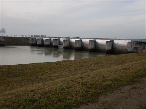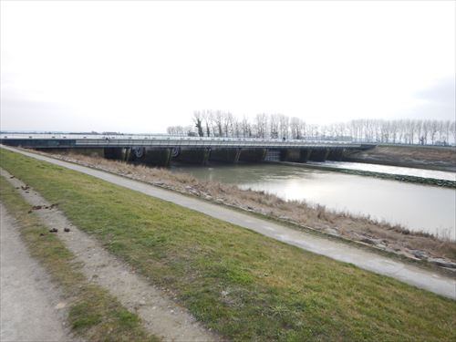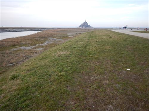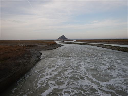 川を分ける堰。左は向かって左のモンサンミッシェルの左の湾に。右は島への橋の下をくぐって島の向かって右に流れる。 |