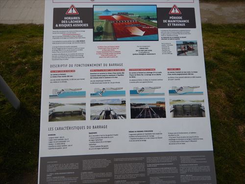 左上 horaires des lachers & risques associes スケジュール 放出とそれに伴うリスク 右上 periode de maintenance et travaux 期間 メンテナンスと作業 その下の太字 ne franchissez pas les barrieres de securite delimitant les zones de chantier 工事区域を示す安全柵を越えないでください 赤字部分 les lachers d'eau sont toujours reallses 6 heures apre l'heure de pleine mer su mont-saint-michel d'autres mouvements d'eau se produisent au niveau du barrage pendant une periode d'1h30 avant la pleine mer jusqu'a 1h30 apres la pleine mer モンサンミッシェルでは満潮から6時間後に放水が行われます。満潮の1.5時間前から満潮の1.5時間後まで、ダムではさらに水の動きが発生する。 |