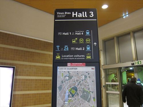 Hall3はモンパルナス駅地上2階で25-28番線ホームがある Hall1は地上2階の1-24番線ホーム Hall2は地上3階で中距離バスやレンタカーが発着する Hall4は地上1階 |