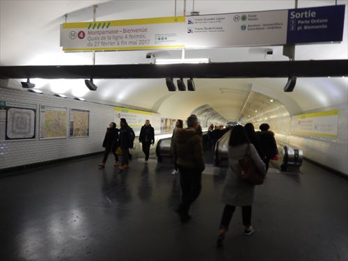 手前の写真の奥は作品展の展示。「ル・ヴィヴァン・コム・モデル」 (生きた世界をモデルとして)」展。この展覧会は、フランス国立科学研究センター(CNRS)とフランス国立交通局(RATP)の共同企画で、2016年12月5日から2ヶ月間開催された。 |