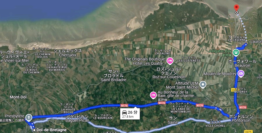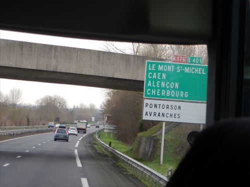 N176とE401併用の高速道路に乗ったところ。モンサンミッシェルまで26㎞。上の写真の右上のE401とN176の文字の間ぐらい |