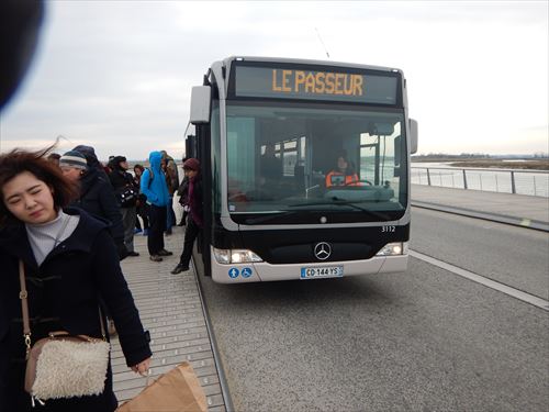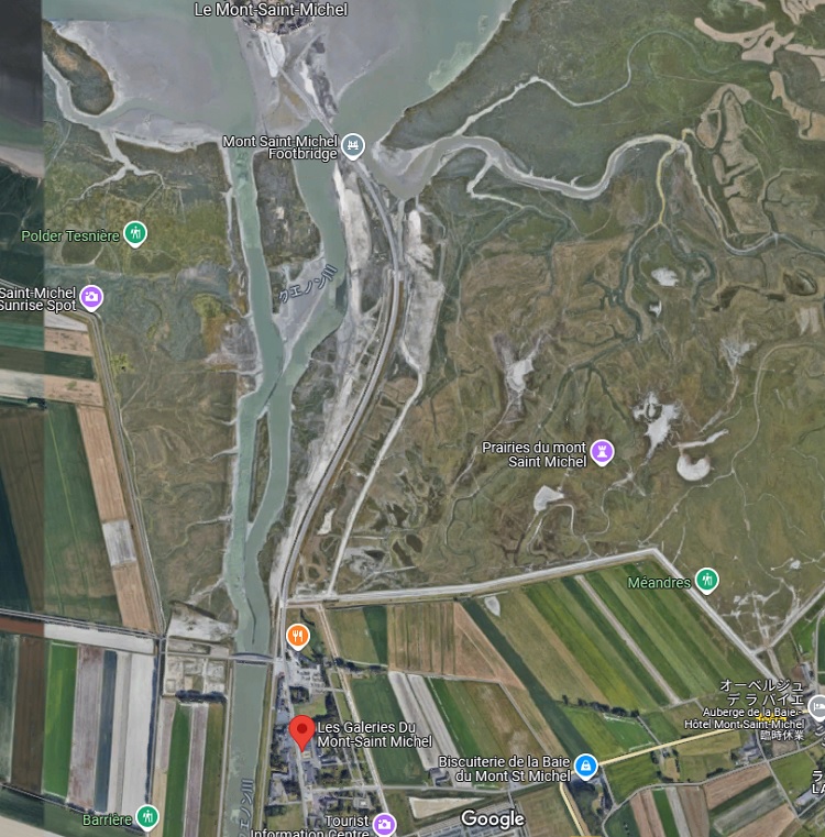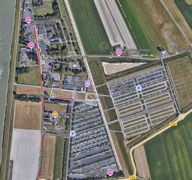 下左の航空写真の中左のLeMontSTMichelのバス停。モンサンミッシェルの入口まで2.7km |