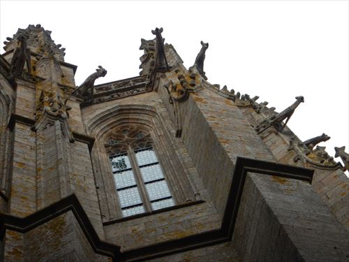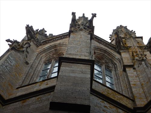 教会の十字の頭部分。3階はChour gothic(合唱席)、2階は Crypte des gros-pillers(大略奪者の墓所) グロテスクが見える |