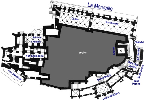 ![]() 1階 左上からsalle de l'aquiolon(アクイオンのホール) N.D.sous-terre(ND地下) anc.hotellerie (古い宿泊所) 中上から Cellier(地下室) Aumonerie(牧師) Rocher(岩) 右上からchatelet(城塞) Le Gouffre(深淵) Salle des gardes(警備室) Belle-Chaise(美しい椅子) Tour Perrine(ペリーヌの塔) Grand Degre(大階段) logis abbatiaux(修道院の住居) |
