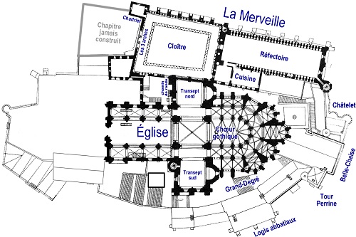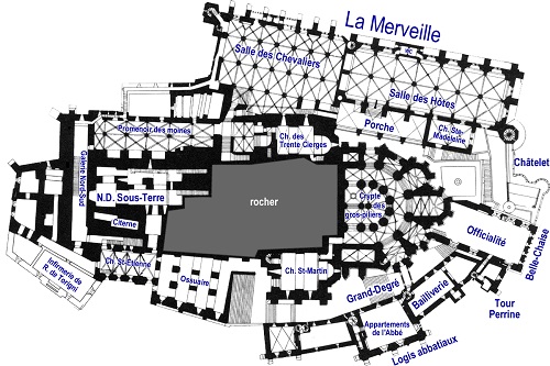 ![]() 3階 上からChapitre jamais construit(予定のみ) Chartrier(古文書保存室) les 3 arches(3つのアーチ) Cloitre(回廊) Refectoire(食堂) Cuisine(台所) Chemin de ronde(歩道) Transept nord(北翼廊) Eglise(教会) Chour gothic(合唱席) Transept sud(南翼廊) Grand Degue(大階段) 右上から chatelet(城塞) Belle-Chaise(美しい椅子) Tour Perrine(ペリーヌの塔) Logis abbatiaux(修道院の住居) |