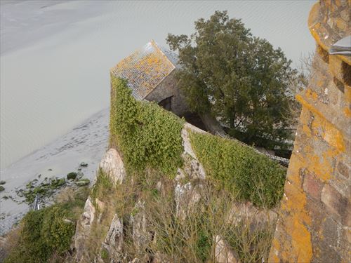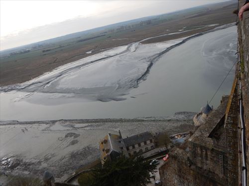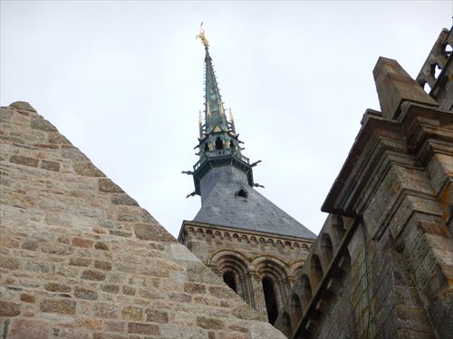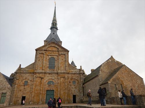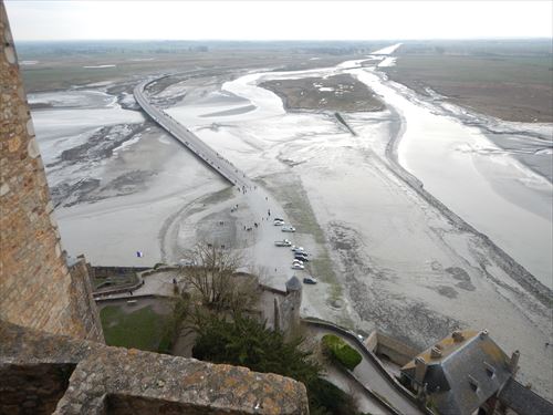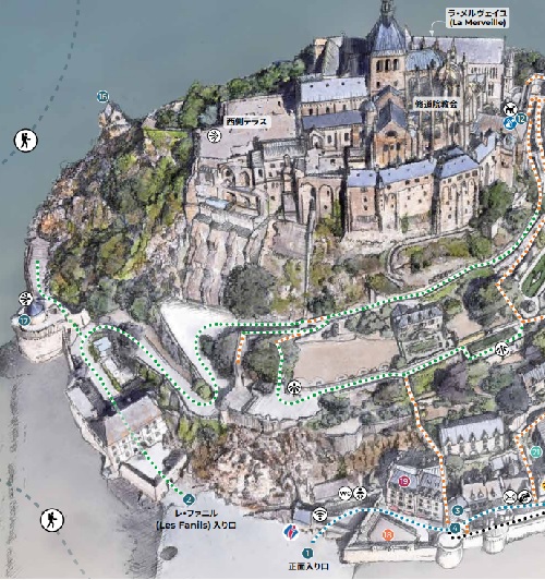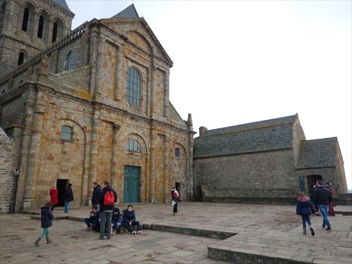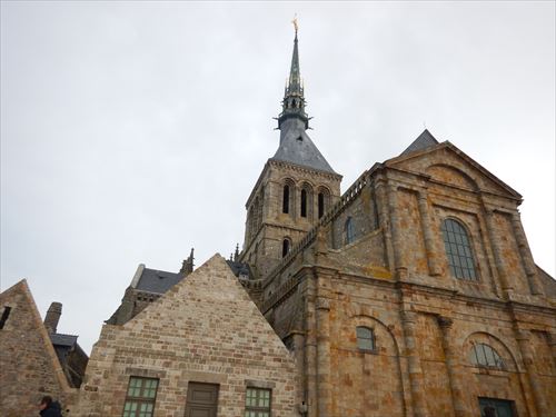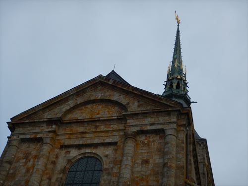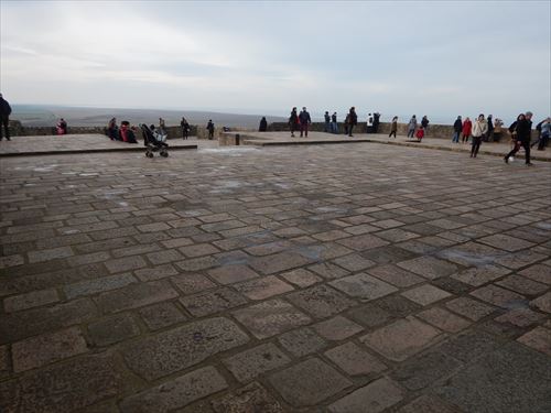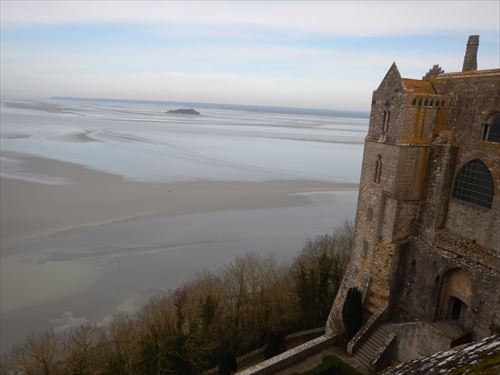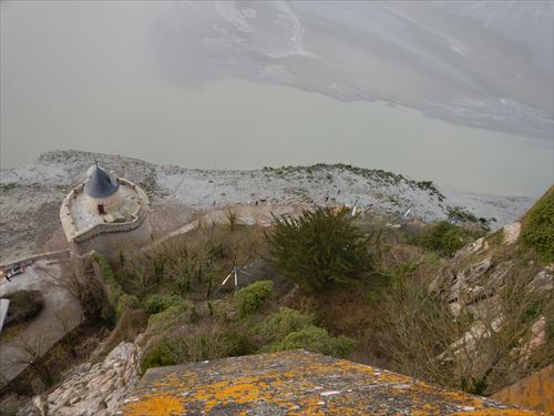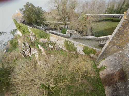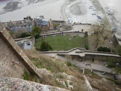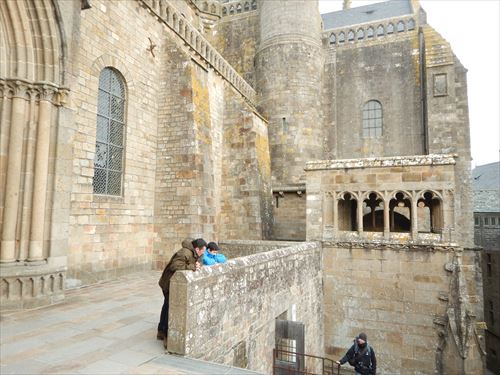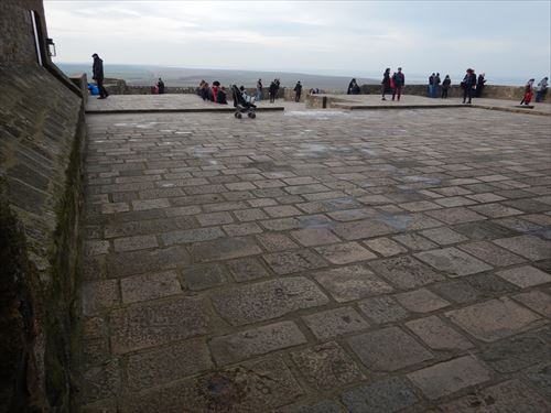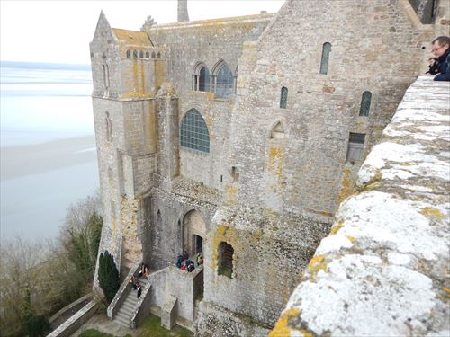 西側のテラスから。中少し上のフランス国旗があるところがLa Terrasse de la Mère Poulard(ラ・メール・プラード広場 右の地図のオレンジの⑱) 写真の左奥に南側のテラスがある。南側のテラスはゴルティエの跳躍(La terrasse du Saut Gautier)と言われる。 ここに投獄されていた、フランソワ1世の囚人で彫刻家のゴルティエが、ボルガールのテラスから身投げしたという話から名付けられた。教会内陣の聖職者席と階段の透かし彫りは彼の作とされる。 14:00 |