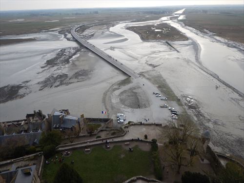 Pont Passerelle(パセレル橋) モンサンミッシェルが浮かぶサン・マロ湾はヨーロッパでも潮の干満の差が最も激しい所として知られる。 満ち引きの差は15メートル以上あり、かつては満ち潮の時には海に浮かび、引き潮の時には自然に現れる陸橋で陸と繋がっていた。最も大きい潮が押し寄せるのは満月と新月の28-36時間後で、沖合い18kmまで引いた潮が、猛烈な速度で押し寄せる。 1877年に対岸との間に道路が作られ潮の干満に関係なく島へと渡れるようになった。しかし、これにより潮流をせき止めることとなり、100年間で2mもの砂が堆積した。急速な陸地化(陸繋島化)が島の周囲で進行し、島の間際まで潮がくることは滅多になくなったため、2009年には地続きの道路が取り壊され、2014年に新たな橋が完成した。 |