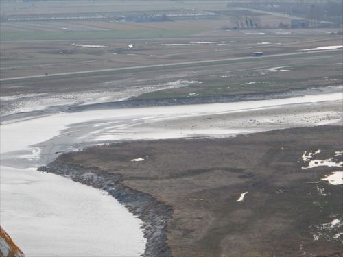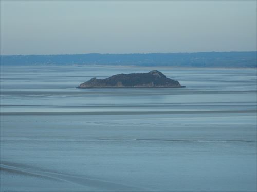 2つ上の写真のアップ。橋のように見えるのはバラージュ・デュ・モン・サン=ミシェル(クエノン川河口堰 Barrage du Mont St Michel) |
