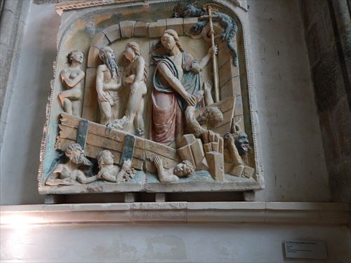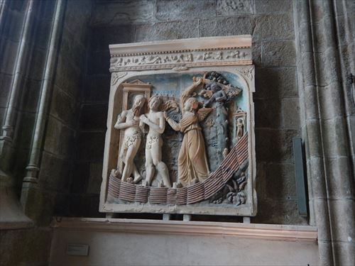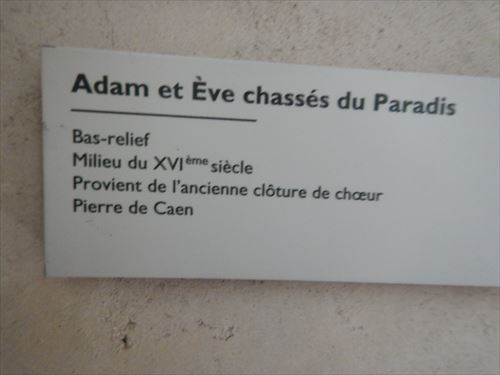 adam et eve chasses du paradis 楽園から追放されるアダムとイブ bas-relief 浅浮き彫り 14世紀中ごろ provient de L'ancienne cloture de choeur(古い合唱席から移設) pierre de caen(カーンの石) |