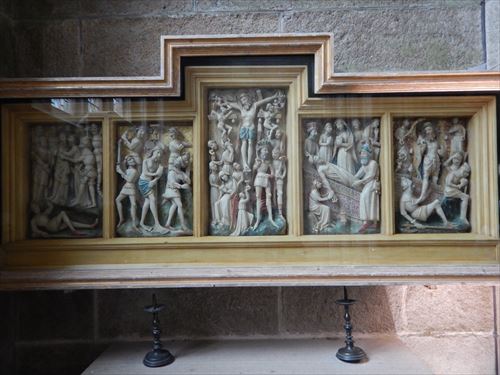 フランスにある他のゴシック建築は、すべて細工のしやすい、柔らかい石灰岩で造られているが、この土地では、花崗岩だけが塩分を含む空気と湾特有の強風に耐えうる材料だったため、敢えて、細工の難しい花崗岩で仕上げられている 奥左にある黒い像は聖ミカエル。その左の側廊の上に十字架のキリスト像がある。少し左手が見える。聖ミカエルは足下に悪の象徴である龍を踏みつけ、手には秤を持っている。これは人の最期に、善行、悪行を秤にかけ、天国か地獄かを決めた言われたことによる。 台座には、"Qvis vt Devs" (神のような人は誰ですか) と記されている。 |