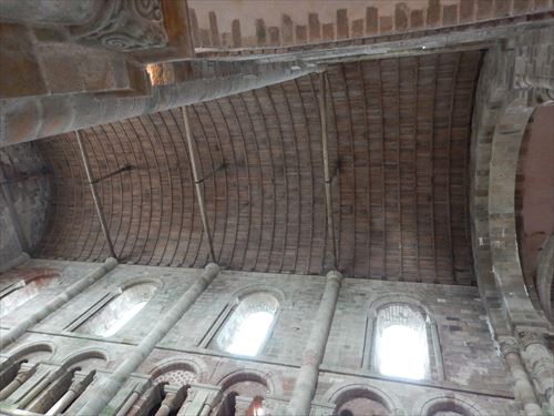 教会内部。交差部の丸い穴の上に鐘がある。その下の床は貫通(ガラスでふさがれている)していて、そこから鐘を鳴らした。 当初((11世紀)、教会全体はロマネスク様式で造られていた。 ロマネスク建築は堅牢さと安全性を指向し、輪郭線と見る者の視線がすべて一点に収斂するように設計されている。15世紀に東の部分(交差部の奥の内陣、その奥の半円の後陣)が重みによって壊れた。 再建された時は、当時流行のゴシック様式で建て直され、奥と手前では建築様式が異なっている。 。 |