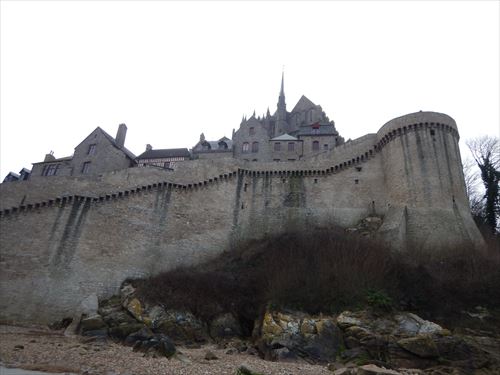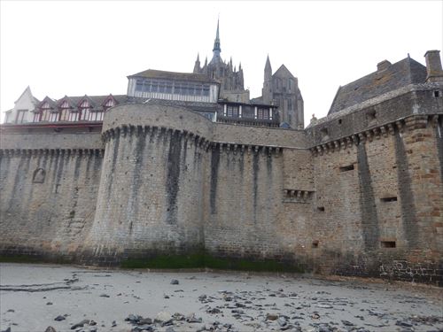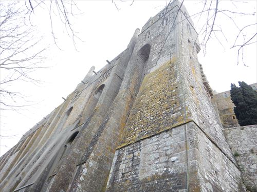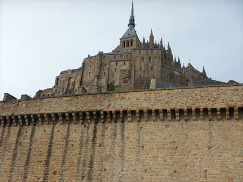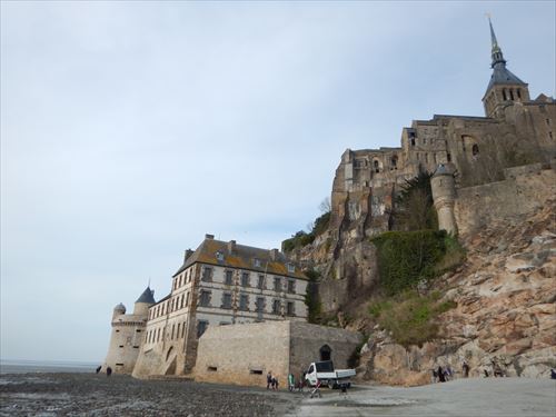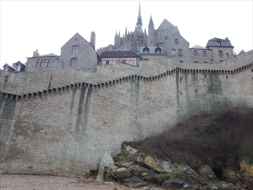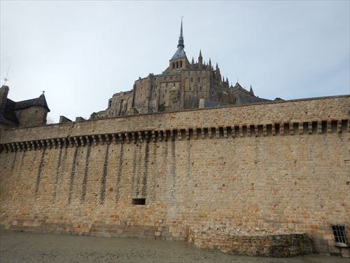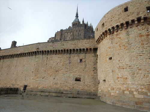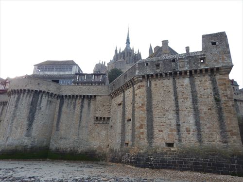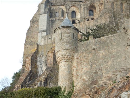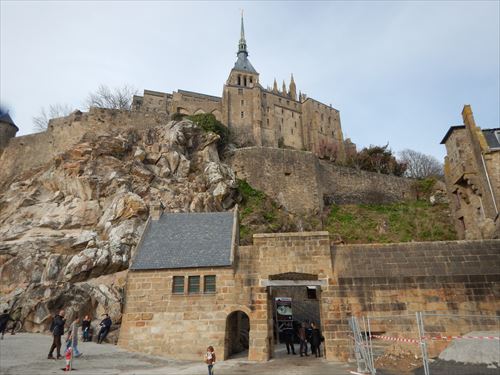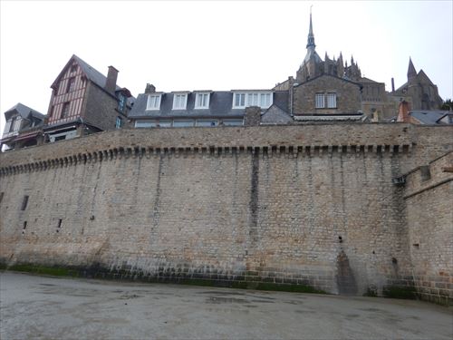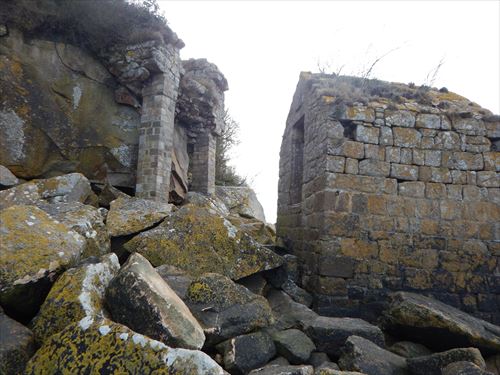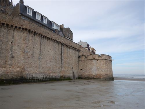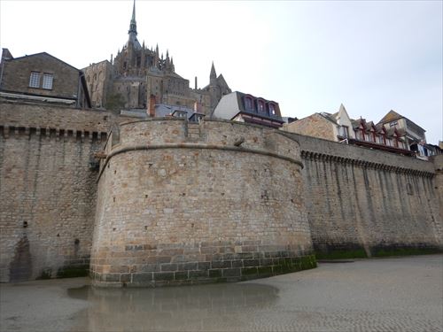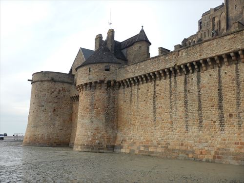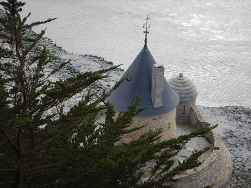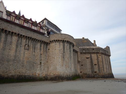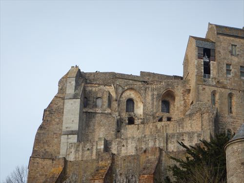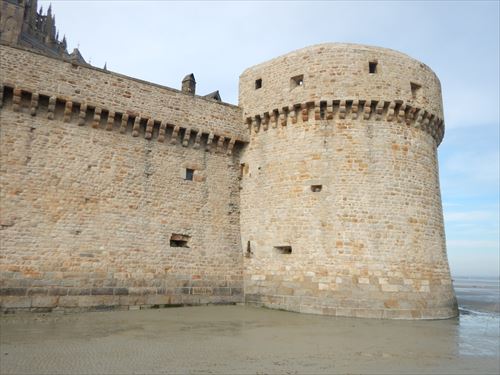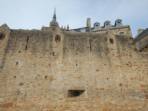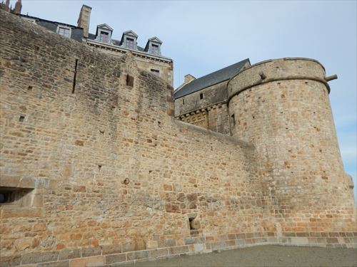 les fanils(レ・ファニ)。現在、国立記念物センターになっているモン・サン=ミシェルの要塞の一部でガブリエル塔を含むこの場所は、フランス革命後に修道院を占拠した看守を収容するための兵舎として 1928 年に完成した。 もともと、この城壁は修道院の倉庫が置かれていた中庭を守っており、そこから岩の頂上まで物資を運ぶ大きな石積みや木材ホッパーにアクセス出来た。城門は要塞化された門によって守られていた。 |