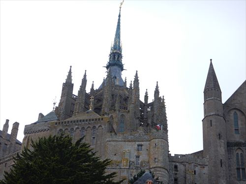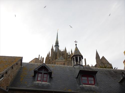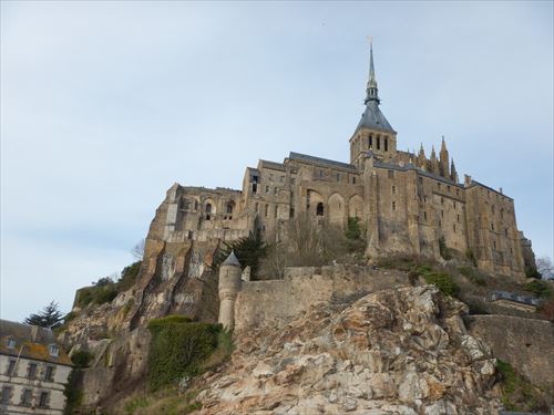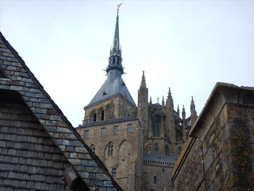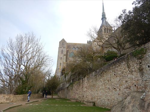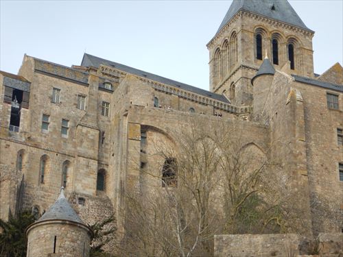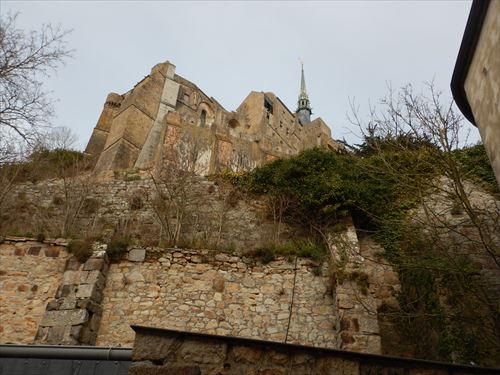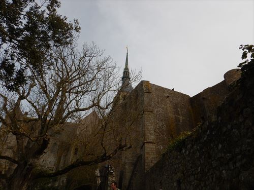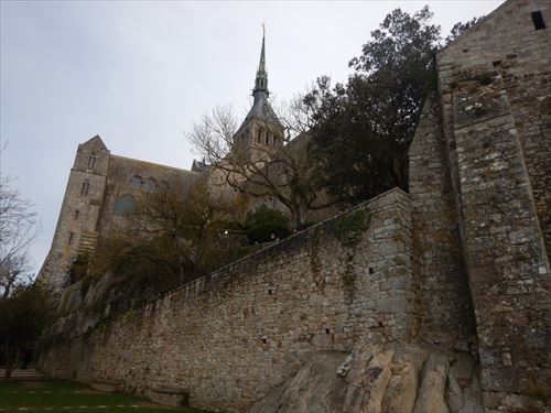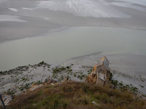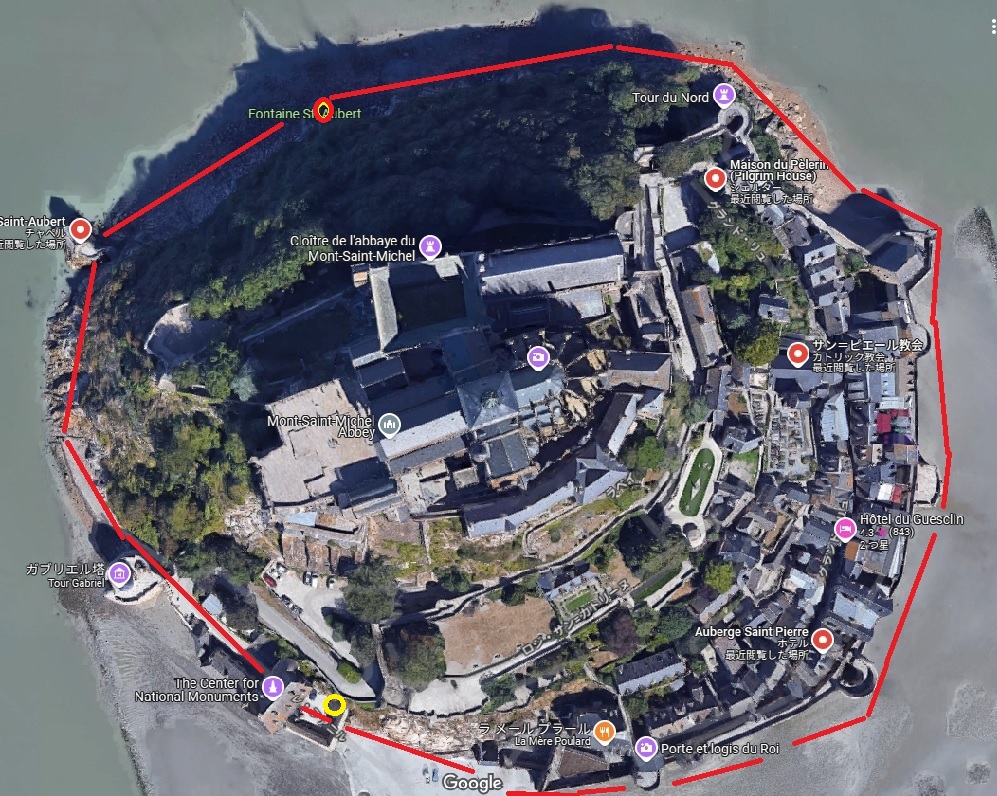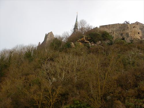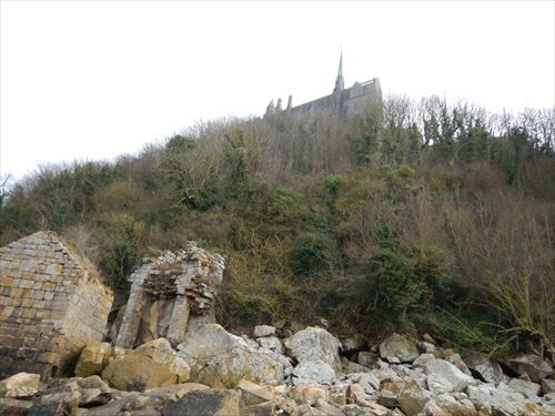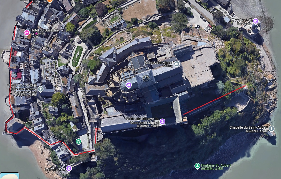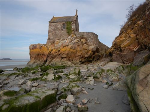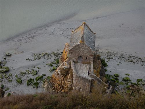 Chapelle du Saint-Aubert(オベール聖堂) 切妻屋根と 2 つの小さな丸いアーチ型の窓を備えた長方形の建物で、切妻の上には聖オーベルトの像が立っている。 建物はロマネスク様式で12世紀頃に、ロベール・ド・トリニ(1154-1186 修道院長)の指揮下で、モンサンミッシェル教会を作った聖オベ-ルを称えて建てられた。 伝説ではここでオベールが天使からモン・サン・ミシェルの建設を命じられたとき、異教の崇拝の石(古代のメンヒル:先史時代の巨石記念物)をひっくり返した。巨大な石を倒せたのはオーベールの腕の中にいた彼の末っ子が石に押し付け、その蹴りで石がひっくり返ったといわれる。 |