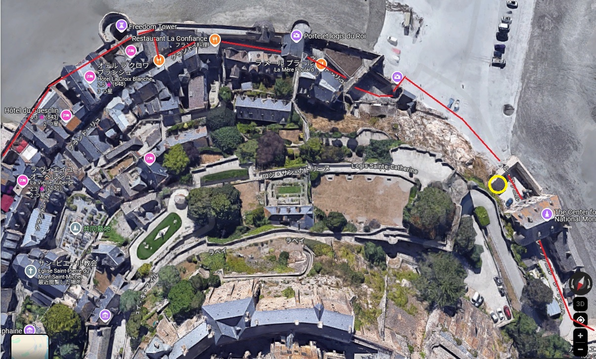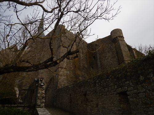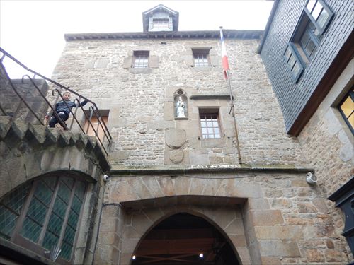 ラ・メルヴェイユ棟の中を通って南東の出口(入口の手前にある)から建物の外に出る。正面の建物は Maison du Pèlerin(ペルランの家)でグランド リュ((Grande Rue 大通り) の頂上(東の端)に位置し、資格証明書(HPはこちら)を所持する徒歩または自転車の巡礼者専用の宿泊施設。 |