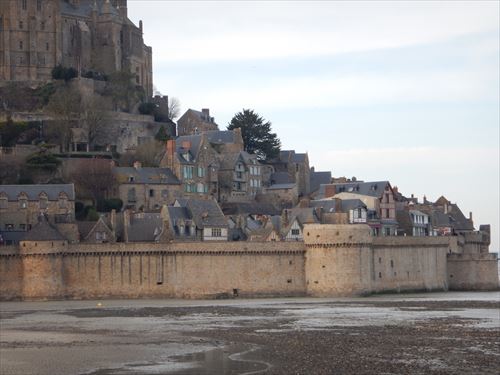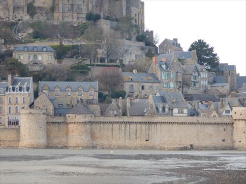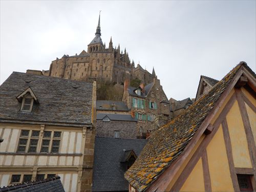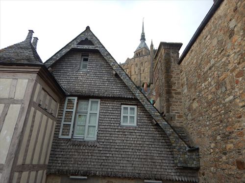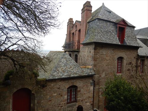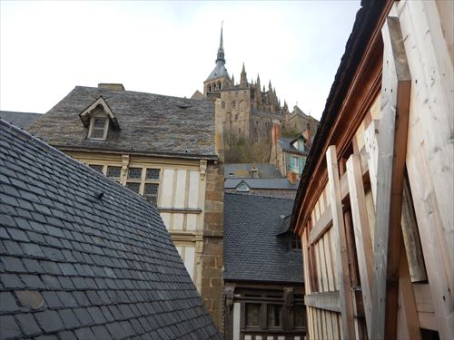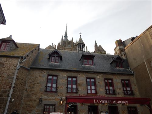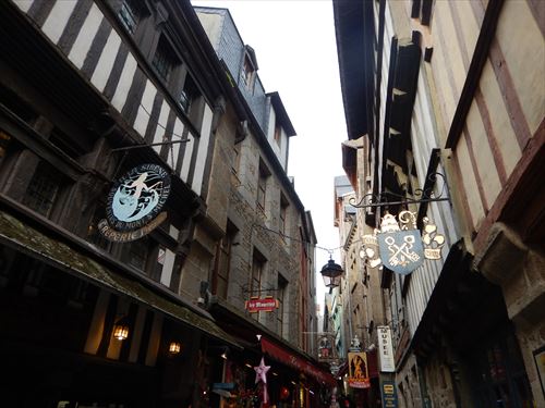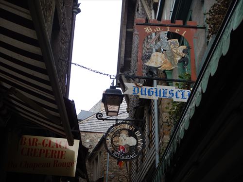 更に奥。手前はHôtel du Guesclin。奥もLe Mouton Blancというホテル 一番奥のMaison du Pèlerin(ペルランの家)まで王の門から200mぐらいしか無い |
