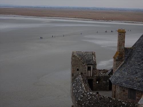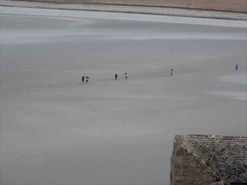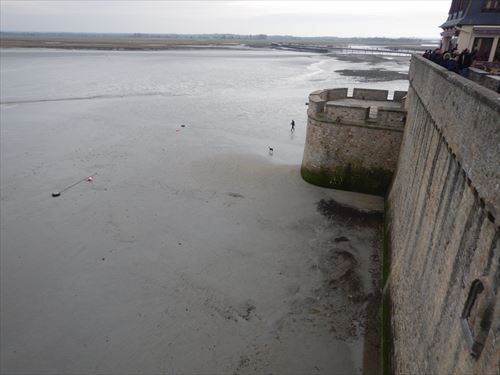 グランド リュ((Grande Rue 大通り)を西に下る 海を歩く人々。手前は要塞。グランド リュは工事中で修道院に向かう際にあるいた城壁を再び歩いた。 | |