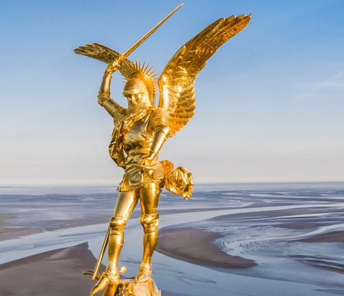 708年、アヴランシュ司教オベールが夢のなかで大天使ミカエルから「この岩山に聖堂を建てよ」とのお告げを受けたが、悪魔の悪戯だと思い信じなかった。再び同じ夢を見たが、また信じなかった。 |