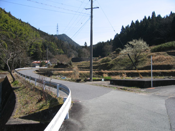 ↑君が野ダム。湖面に風波がたっている ↑美杉町山口 右へ行くと矢頭峠、奥が君が野ダム