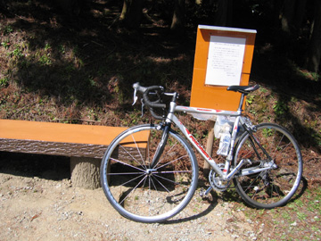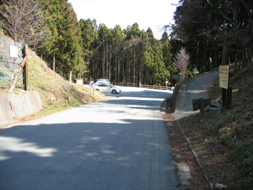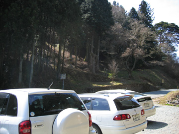 駐車場のベンチで一休み ↑駐車場から登山口を見る