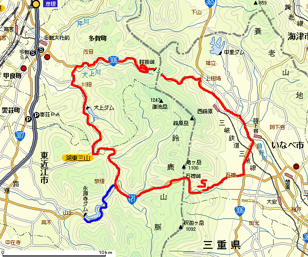 この後、R421を東へ曲がるところを西に曲がり、永源寺ダムへ片道7.2km、往復14.2kmのロス