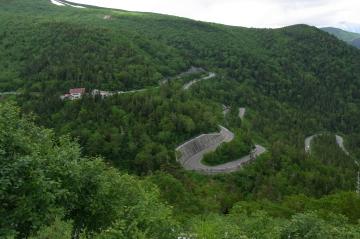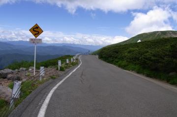 左が位ヶ原山荘。つづら折の坂は青山高原の6合目に似てる ↑真ん中右のところが最高地点の県境ゲート