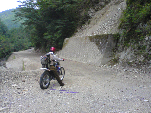 Mさんのトライアルバイクにロープをつけ引いてもらう。
