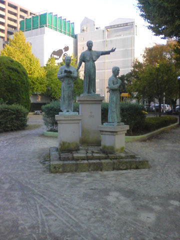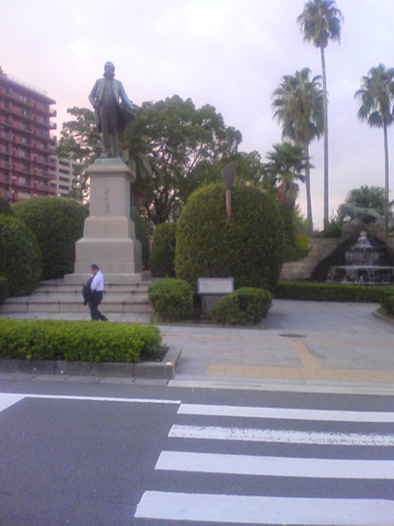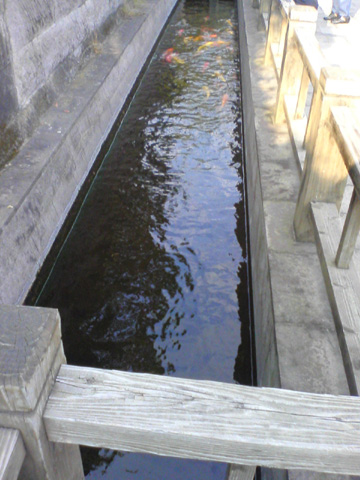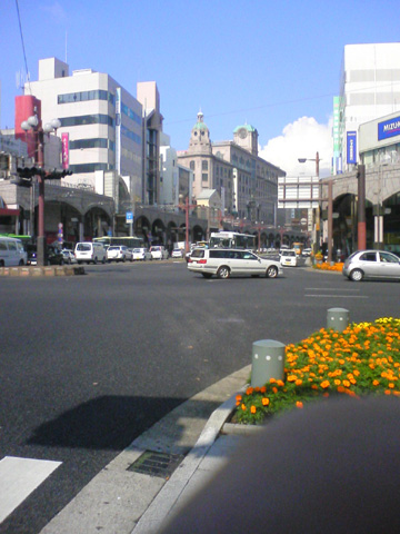 銅像のある鹿児島城(鶴丸城)の前の通りで。小川に錦鯉。