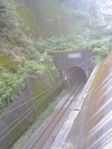 鶴山をくぐる鹿児島本線のトンネル「敬天愛人」の字が見える