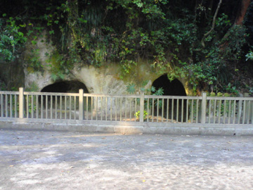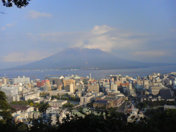 ↑西郷が隠れた洞窟(地図D) 城山公園から見た桜島 ↑