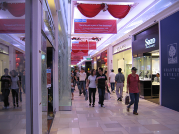配置図。Galleria(緑)はブティック、Tropics(黄)は小物、電気製品、趣味関連 Entertainment(赤)はシネコン