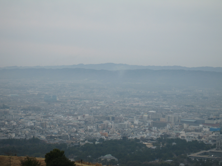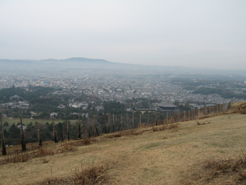 頂上から平城宮跡(飛行場みたいな平地)を見下ろす