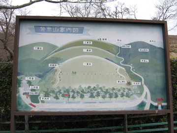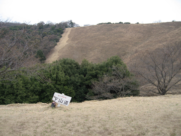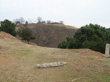 古墳がある三重目(山頂)から二重目からの尾根を見る ↑三重目の標識