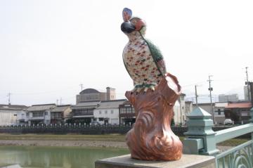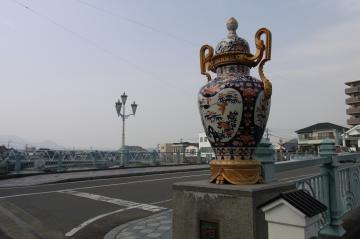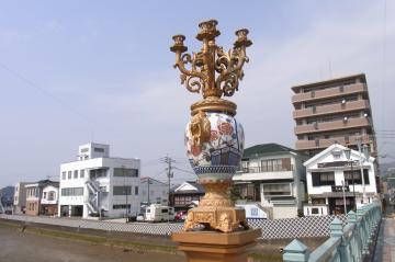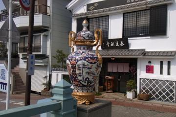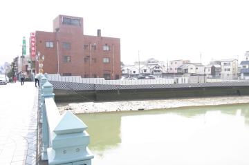 レンガ色の佐賀銀行の右奥に陶器商家資料館が見える