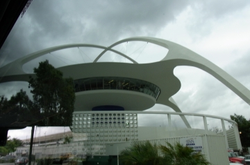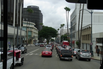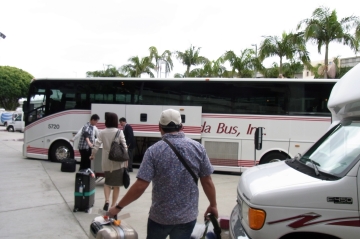 ロスアンゼルス11時着。天候:曇 6人で大型バスに