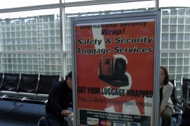 荷物ラップマシーン 危険物の見本もアウトドア関係多し 直前でスーツケースを手荷物を分けてクリア